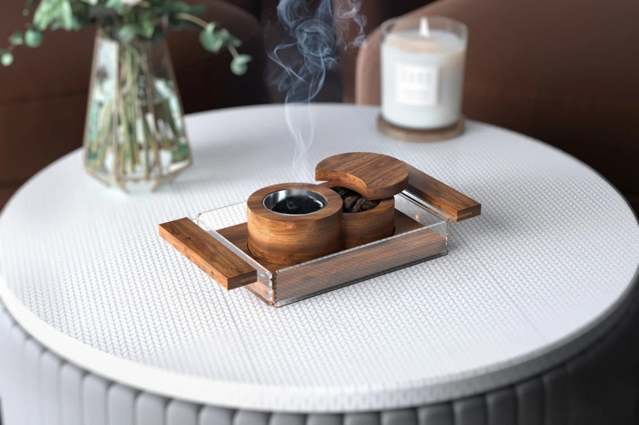 Crafted from wood, this madkhan burner has an Oud compartment on the side, and comes with an acrylic tray which can be used as a stand alone tray perfect for serving. Let this sophisticated set elevate your Oud-burning experience. Perfect for filling your home with the gentle aroma of bakhoor, this burner doubles as a refined decor piece, where heritage meets sophistication.