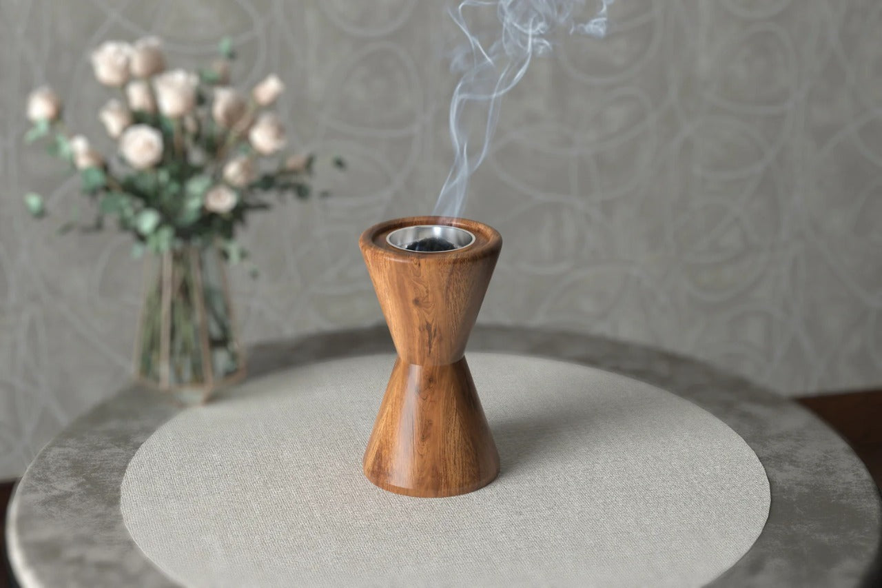 This Madkhan burner combines timeless tradition with natural elegance. The smooth wooden body enhances the beauty of the incense ritual, offering both durability and warmth in design. Its sturdy build ensures safe and steady use, while the rich stain highlights the natural grain of the wood, making each piece uniquely distinctive. Perfect for filling your home with the gentle aroma of bakhoor, this burner doubles as a refined decor piece, where heritage meets sophistication.
