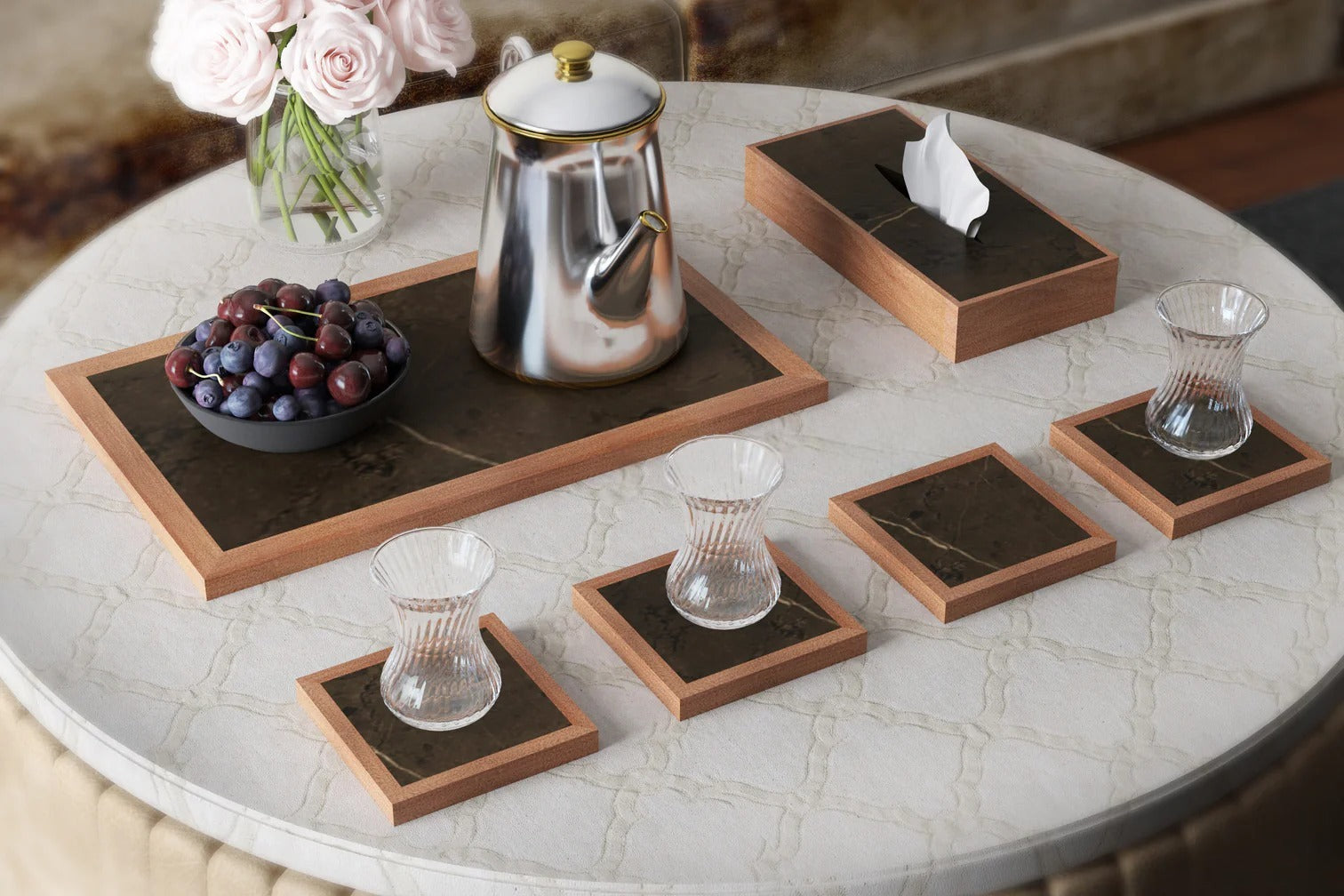 Items Included: 1 Serving Tray, 4 Coasters, 1 Tissue Box