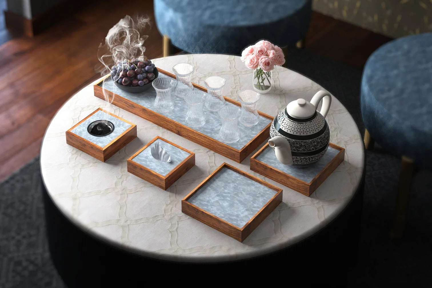 Items Included: 1 big tray, 2 small trays, 1 madkhan, 1 tissue box